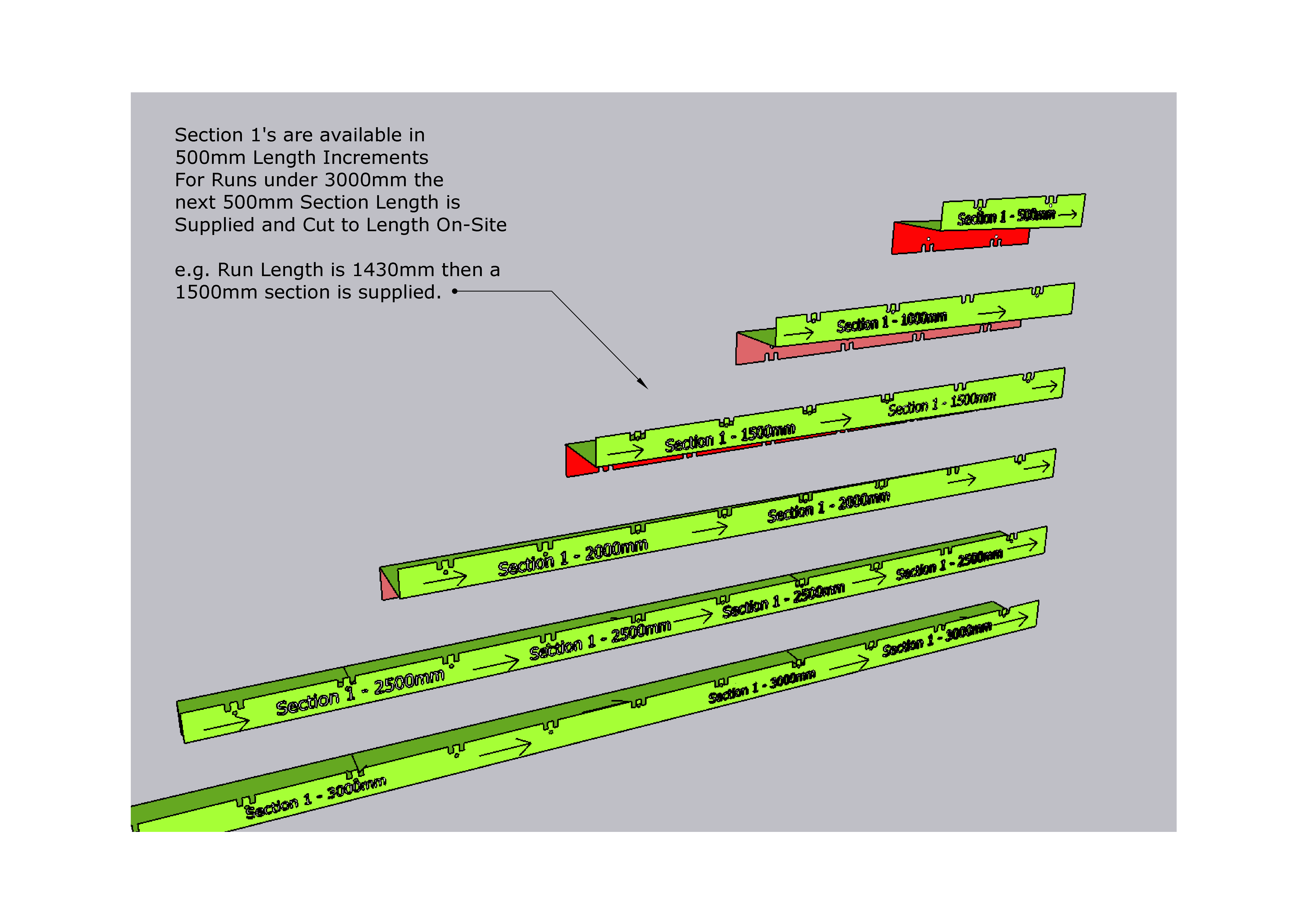 The Standard Section Length is 3000mm. Shorter Channel Sections are supplied (500mm, 1000mm, 1500mm, 2000mm 2500mm) for runs under 3000mm which are cut to length on site.