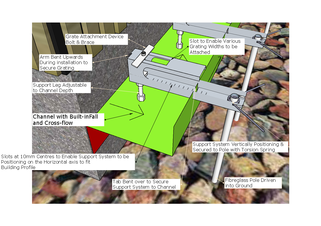 Adjustable Support Systems: Flexible Modular system: Height, Width and Grate Width adjustment during installation to create 12mm mimimum gap between grate and varying building line
